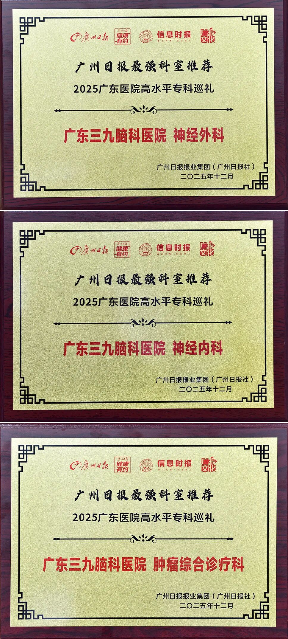 12月23日,由广州市卫生健康委员会指导,广州日报报业集团(广州日报社)主办的“2025广东医院高水平专科巡礼暨院企合作优秀案例推荐、医学成果创新转化大会”在广州国际生物岛举行。活动现场发布了《2025广东医院高水平专科巡礼》推荐名单以及《高水平专科就医一本通》手册,广东三九脑科医院神经外科、神经内科、肿瘤综合诊疗科入选推荐名单。